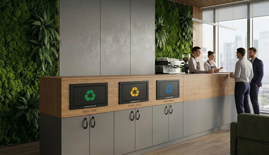 Atliekų rūšiavimo rinkinys: 3 integruotomis šiukšliadėžės durelėmis 350x200 mm, juoda su žalia, mėlyna ir geltona rūšiavimo simboliais